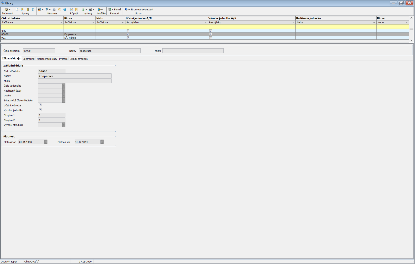 Mezi základní údaje patří popis daného střediska včetně zodpovědné osoby a platnost střediska.