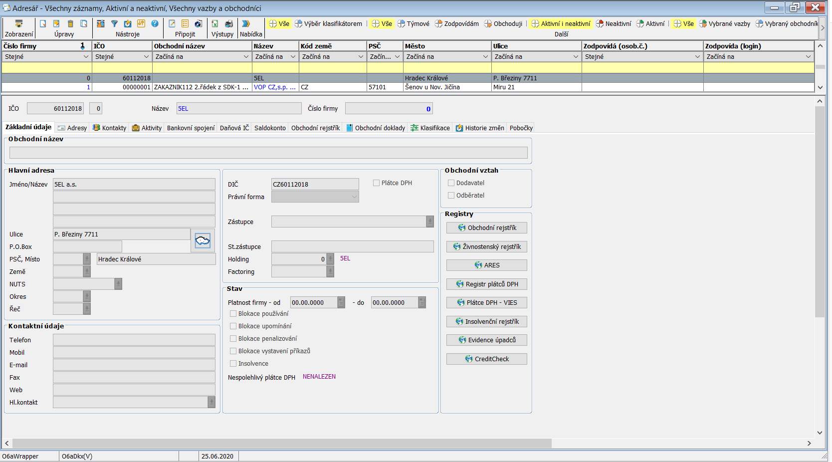 - Základní údaje - Hlavní adresa, Kontaktní údaje, Obchodní vztah, Stav firmy, Registry (možnost otevření webových stránek příslušného registru).