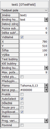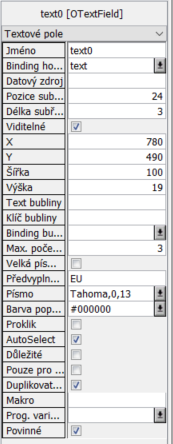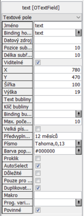 - Text bubliny - Umožňuje zadat text nápovědy, která bude zobrazena v bublině při najetí myší na toto pole.