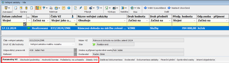1. Práce začíná zadáním veřejné zakázky Zadání vetšinou dělá odpovědný pracovník. Začíná vyplněním hlavičky a postupně vyplní „specifikaci veřejné zakázky“ - záložky „Parametry VZ“ - „Zásady OVZ“.
