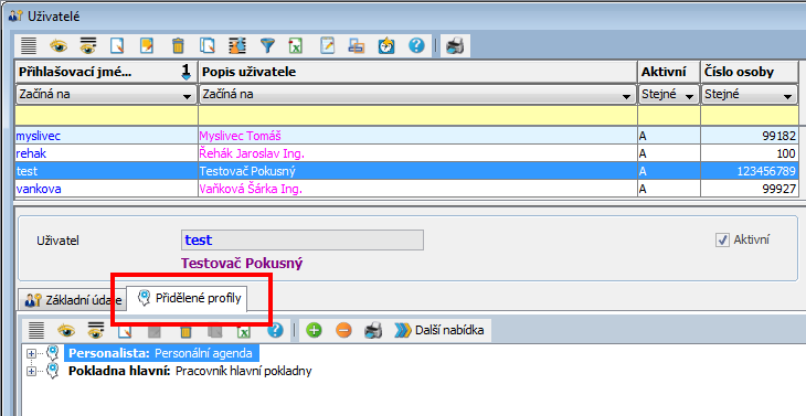 Profil přehledně sdružuje nastavení přístupů k úlohám a datům. Oprávnění plynoucí z jednotlivých profilů přidělených uživateli se sčítají.