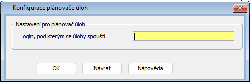 - Spustit úlohu - okamžité ruční spuštění úlohy, bez ohledu na plán. Pokud se po spuštění objeví hláška „… Plánovač úloh není aktivní, zkontrolujte konfiguraci plánovače“, je potřeba ve volbě Nabídka/Nastavení vyplnit login, pod kterým se budou úlohy spouštět.