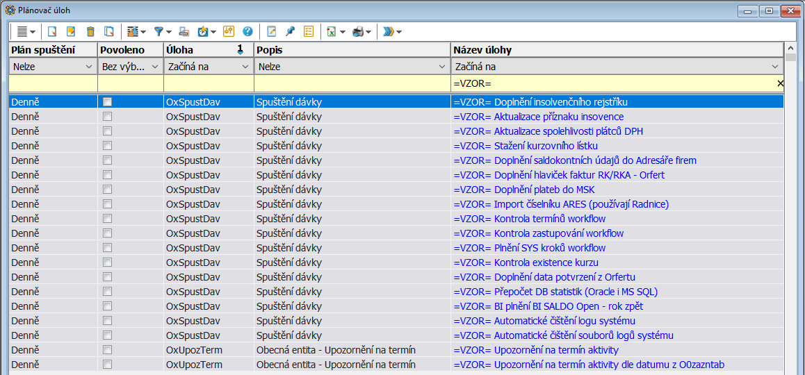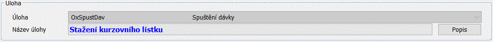 - OxSpustdav- obecná úloha pro spouštění dávek (např. stahování kurzovního lístku, doplnění insolvenčního rejstříku apod.). Konkrétní akce je určena v parametrech úlohy. Podrobněji zde.
