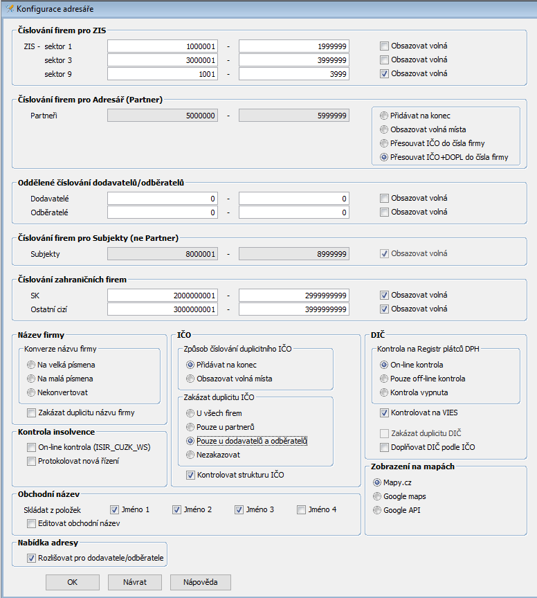 - Dodavatelé - rozsah čísel firem pro dodavatele, tj. pro firmy, které mají v klasifikaci zaškrtnut příznak Dodavatel. Rozsah má přednost před intervaly pro Adresář a Subjekty. Pro nevyplněný interval, tj. od 0 do 0, se použije rozsah pro Adresář resp. pro Subjekty. Lze nastavit možnost „Obsazovat volná“, potom se čísla přidělují tak, že se využívají i volné mezery v řadě existujících čísel firmy. Jinak se přidělí nejvyšší existující číslo firmy plus jedna. Toto nastavení má smysl vyplnit pouze tehdy, je-li požadováno odlišné číslování dodavatelů a odběratelů.