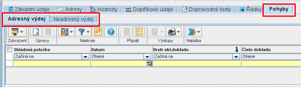 Po uložení se musí zapsat pohyb Dodacího listu. V záložce Pohyby lze zapsat Adresný výdej nebo Neadresný výdej. Adresný i neadresný výdej mají stejný postup zápisu, záleží na tom, jaký pohyb se bude zapisovat.