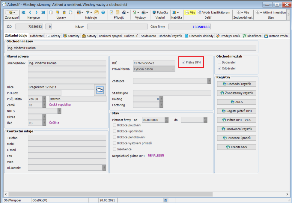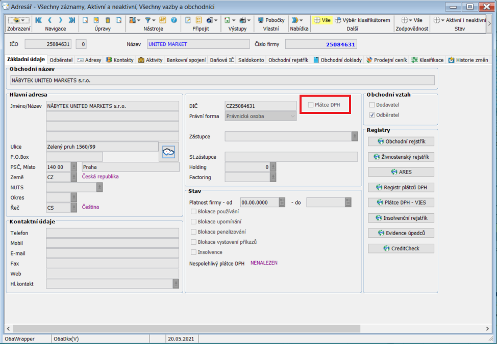Na příkladu níže je ukázán zákazník, který není plátcem DPH a řádek prodejní objednávky pro tohoto odběratele, kdy je automaticky nastaven typ ceny na jednotková cena včetně DPH.