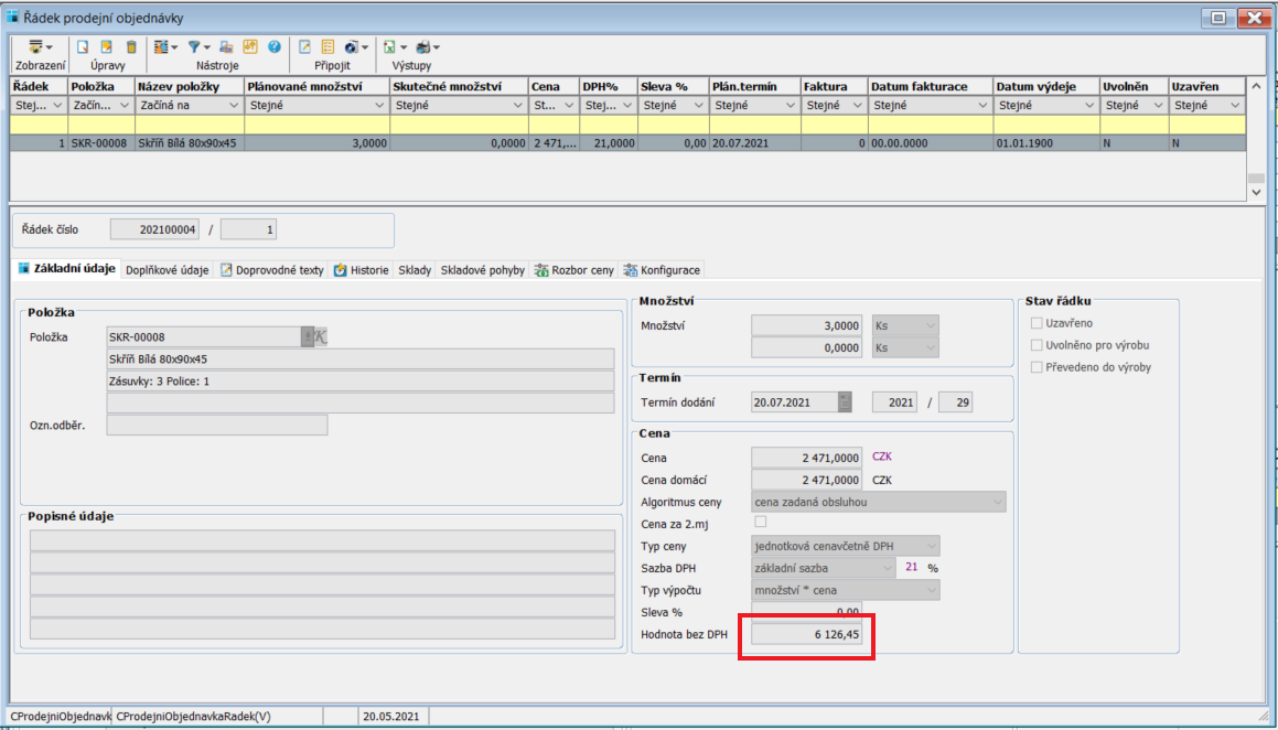 Na příkladu níže je ukázána firma, která je plátce DPH a řádek prodejní objednávky pro tohoto odběratele, kdy je automaticky nastaven typ ceny na jednotková cena bez DPH.