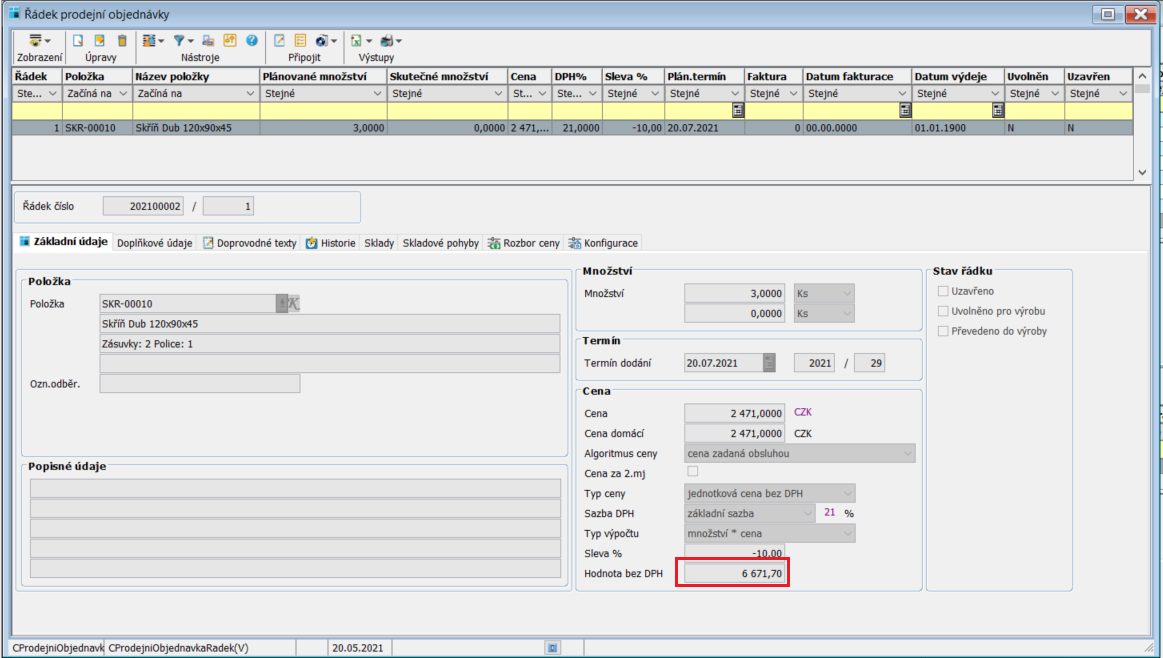 Zde cena bez DPH odpovídá ceně řádku po slevě. Navíc zde do výpočtu výsledné ceny vstupuje také sleva 10%, která je nastavena pro tento řádek prodejní objednávky.