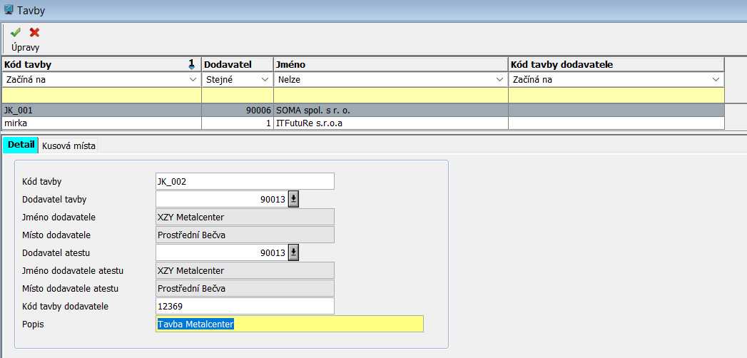 Pod záznamem v tabulce Tavby se nachází dvě záložky Detail a Kusová místa.