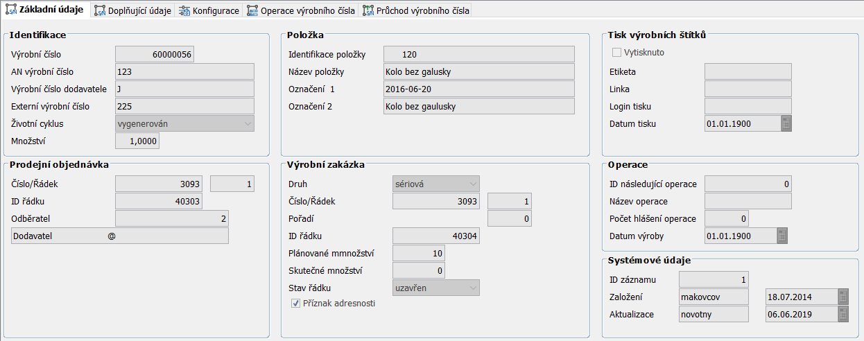 Každý záznam (výrobní číslo) v tabulce obsahuje základní údaje. Na základě těchto údajů lze snadno identifikovat položku, prodejní objednávku i výrobní zakázku která je vázána na dané výrobní číslo.