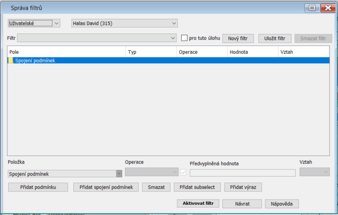 Filtry - Správa filtrů umožňuje připravit si filtry s kombinací podmínek, na základě kterých je možné rychle filtrovat data, případně daný filtr vypnout.