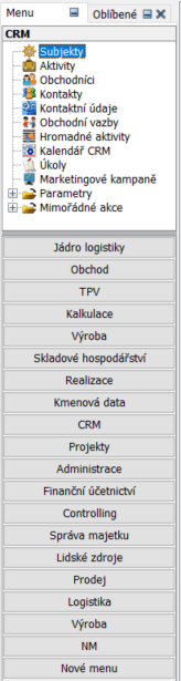Celé MENU je rozděleno do 2 částí, kdy spodní část obsahuje jednotlivé moduly systému rozdělené do jednotlivých záložek a horní část obsahuje rozbalenou nabídku vybrané záložky.
