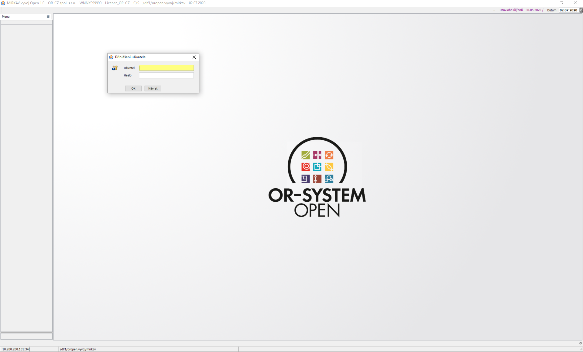 Pro přihlášení do systému slouží uživatelům ORsManager, který se otevře rozkliknutím ikony na ploše vašeho firemního PC. Standardně mají běžní uživatelé připojení pouze na ostrá data (pojmenování připojení obvykle koresponduje s názvem firmy) ale v rámci testování nové verze, či zakázkových úprav zde může být více připojení (například testovací data a podobně).