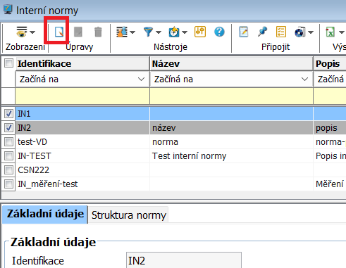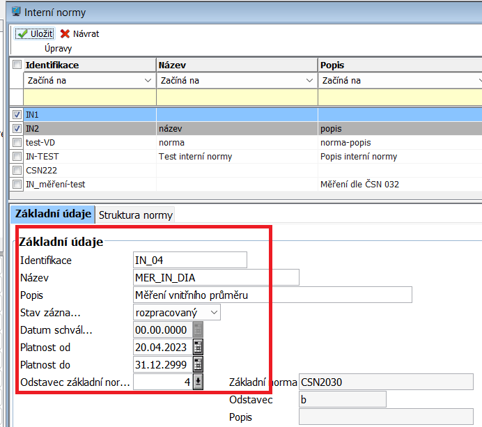 Vyplníme atributy Identifikace normy, Název, Popis, Platnost Od-Do.