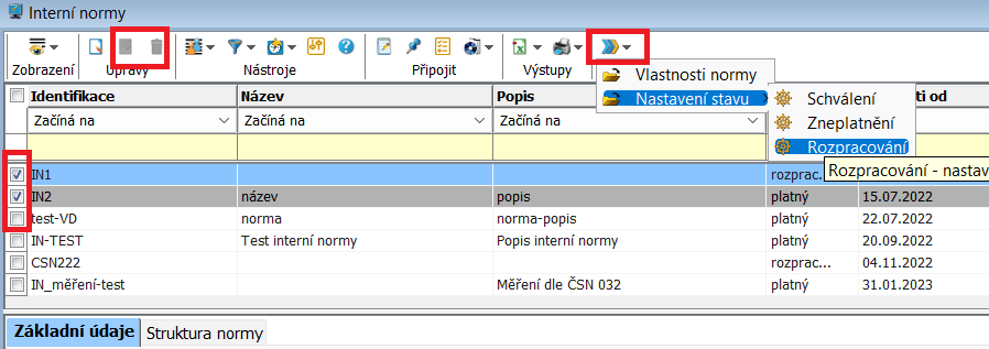 V případě, že chceme normu editovat, či smazat, musí být ve stavu „Rozpracovaný“. Pomocí zaškrtnutého pole checkboxu (vlevo) vybereme jeden, nebo více záznamů. Nastavení stavu provádíme pomocí tlačítka Nabídka