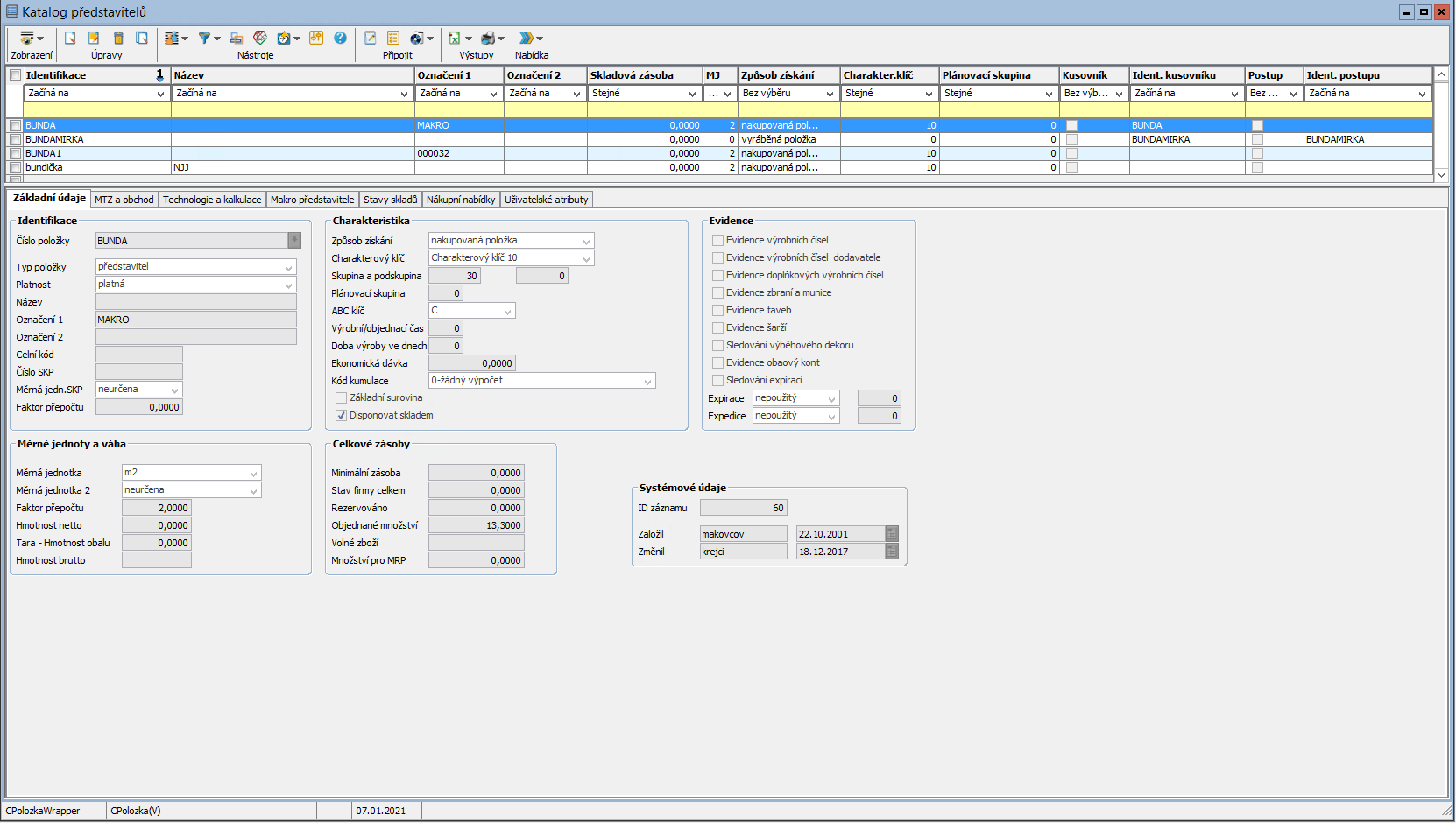 Při založení nové položky pomocí konfigurátoru se podle vyplnění představitele přednastaví jednotlivá pole pro zakládaný výrobek. Tato pole je možné v případě potřeby změnit nebo nevyplněná vyplnit.