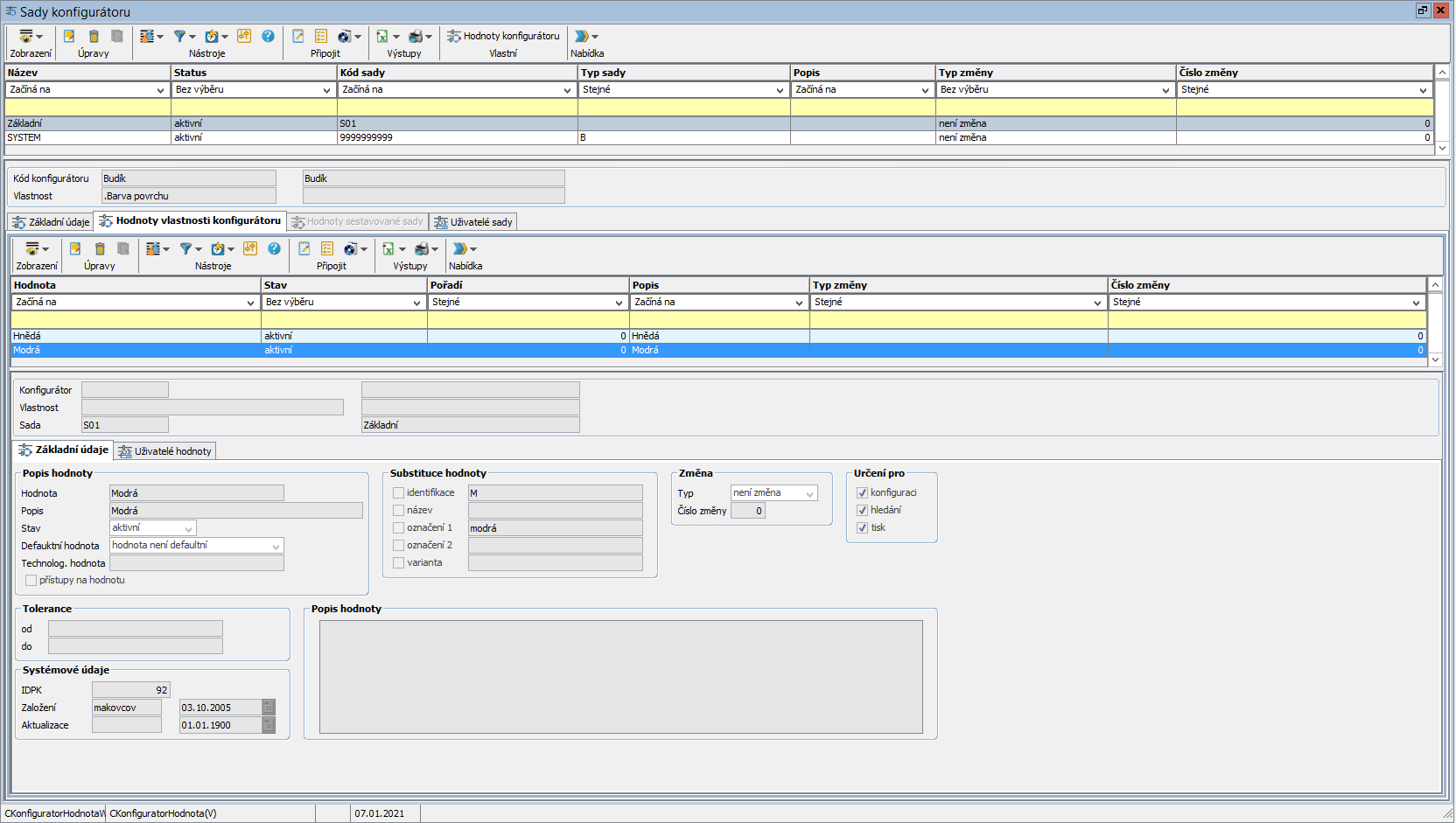 Jestliže se k některé vlastnosti dodatečně doplní sada nebo k sadě hodnota je nutné provést toto doplnění i v konfigurátoru. Doplnění je možné provést u vlastnosti konfigurátoru funkcemi přidání sady nebo doplnění hodnot. Přidat lze jedině sady (nebo hodnoty), které jsou pro konkrétní vlastnost založeny.