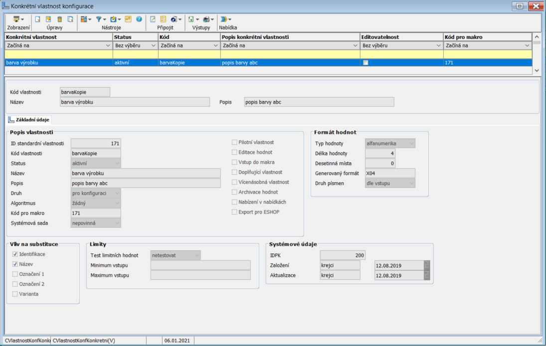 Tato úloha slouží pro evidenci konkrétních vlastností, které mohou blíže specifikovat jednotlivé standardní vlastnosti vybrané položky. Každá konkrétní vlastnost je vázána přímou vazbou na standardní vlastnosti a slouží pro bližší specifikaci této vlastnosti.