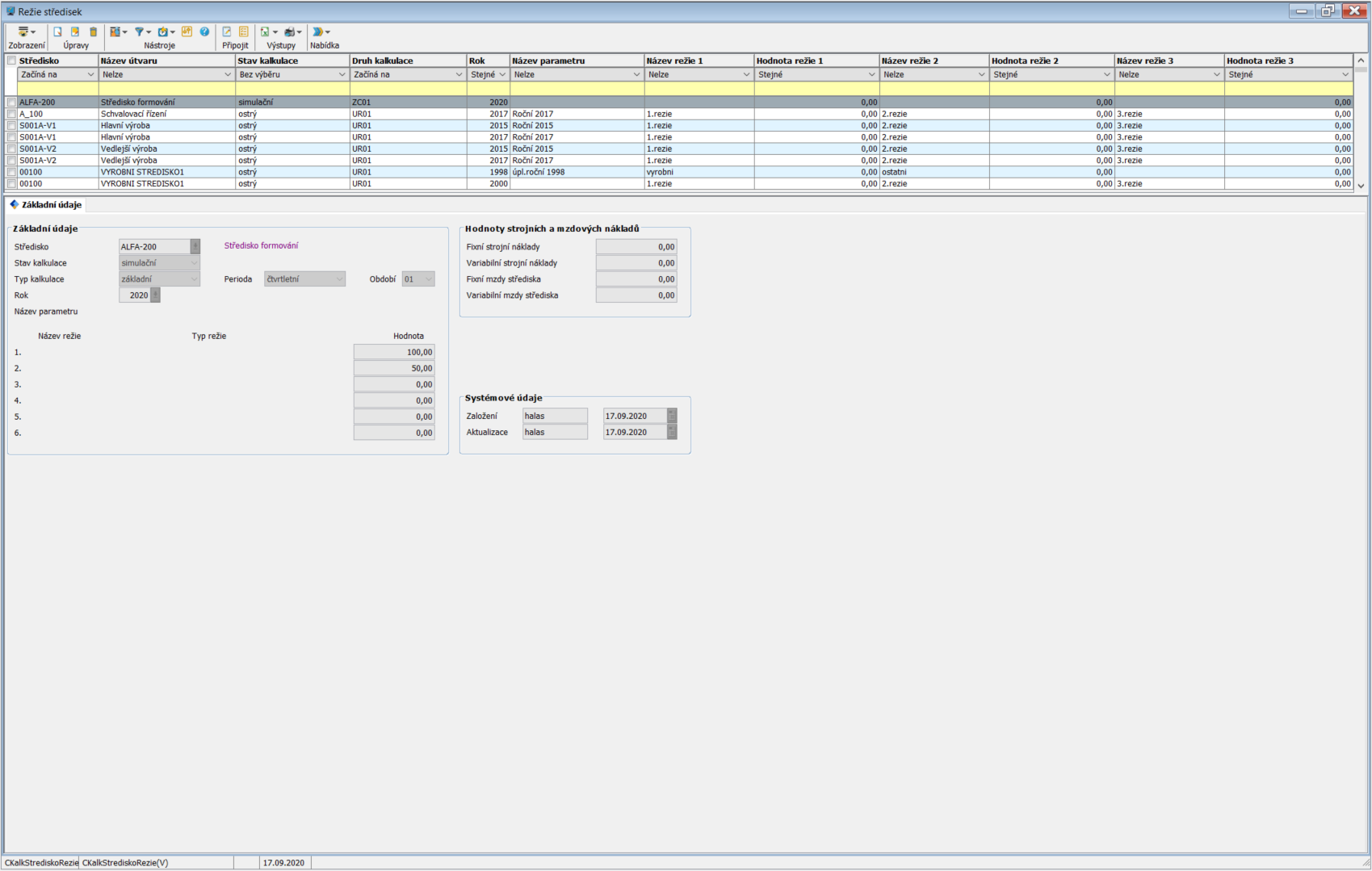 Ke každému parametru a středisku je nutné nadefinovat hodnoty režijních nákladů – režii středisek a strojní náklady.