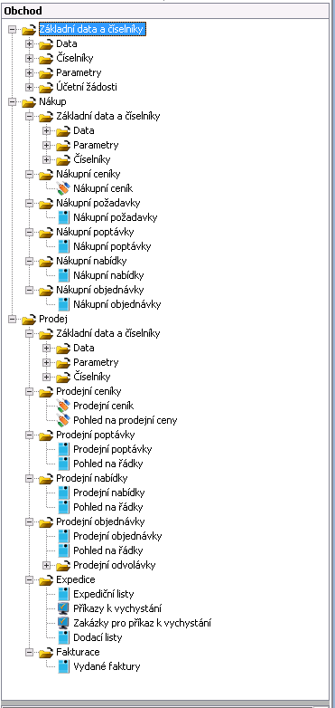 Celý modul Obchod je rozdělen do 3 hlavních kategorií. První kategorií jsou Základní data a číselníky, která obsahuje veškeré návazné a doplňující úlohy pro nákupní a prodejní programy. Dále jsou zde dostupné veškeré číselníky pro tyto úlohy. Dalšími kategoriemi jsou právě Nákup a Prodej.
