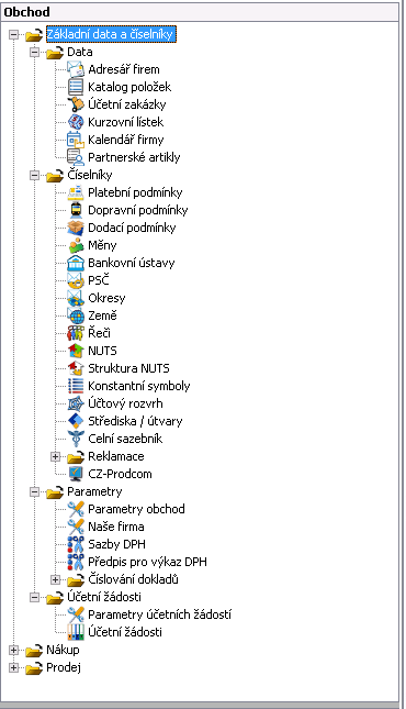 Ve složce Základní data a číselníky jsou veškeré pomocné úlohy pro úlohy v oblasti obchodu. Zde lze najít například adresáře a návazné úlohy, které jsou využívány pro automatické doplňování údajů při tvorbě obchodních dokladů a v dalších úlohách. Do těchto pomocných úloh se uživatel dostává proklikem z detailu při vytváření nových záznamů, nebo při úpravě již existujících záznamů.
