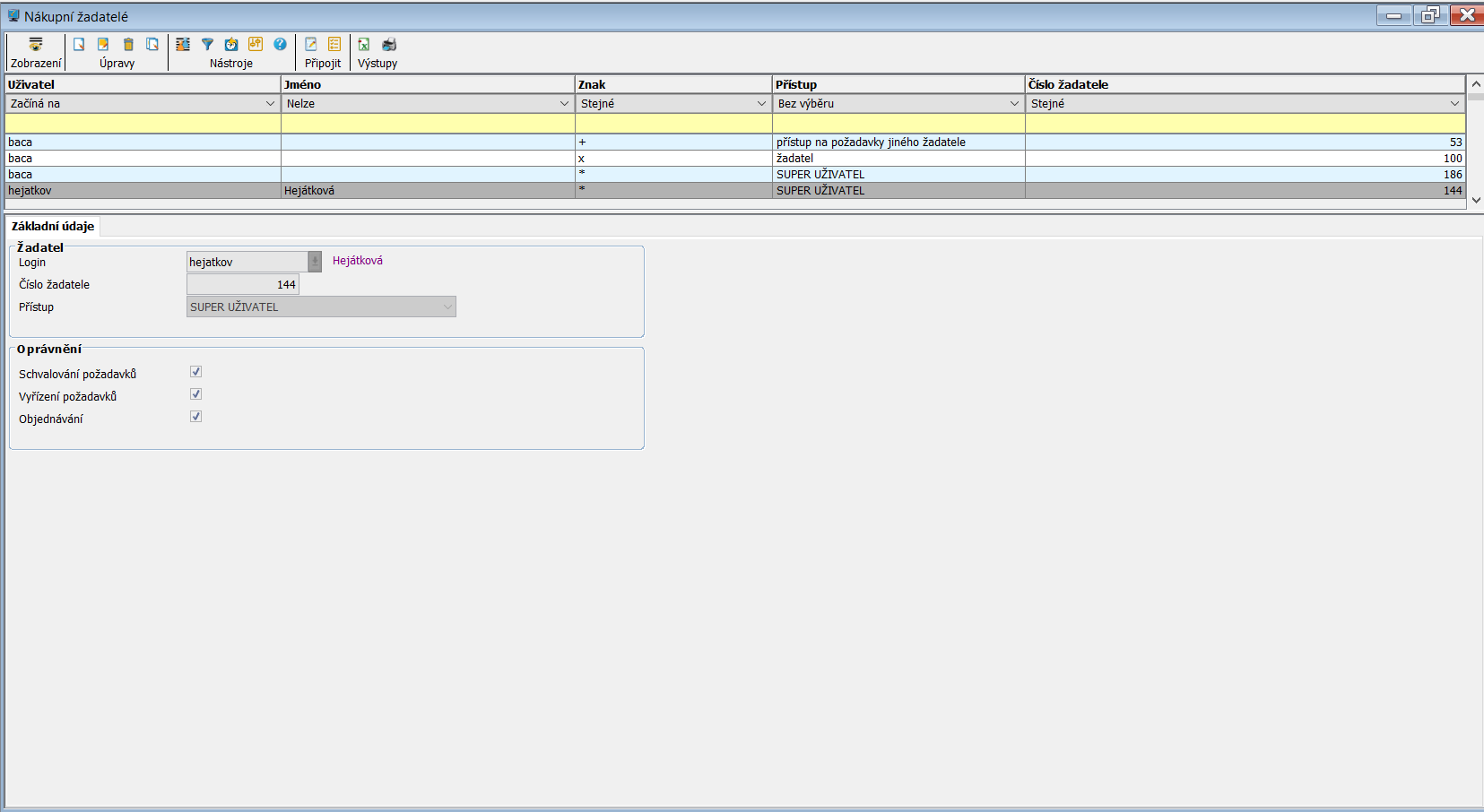 Tento uživatel je označován speciálním znakem „ X “ nebo „ + “. Uživatel se speciálním znakem „X“ vždy zapisuje nové požadavky pod číslem se znakem „X“ a je-li přihlášen pod svým číslem má ihned přístup na všechny žadatele, u kterých má znak „+“.