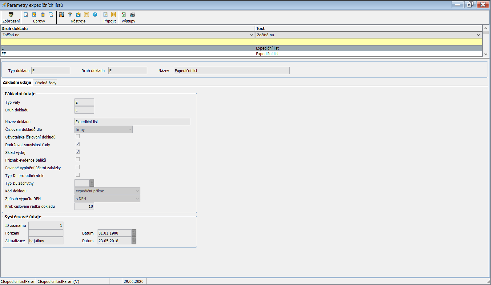 Obsahuje nastavitelné parametry pro správnou funkci modulu Expediční listy.