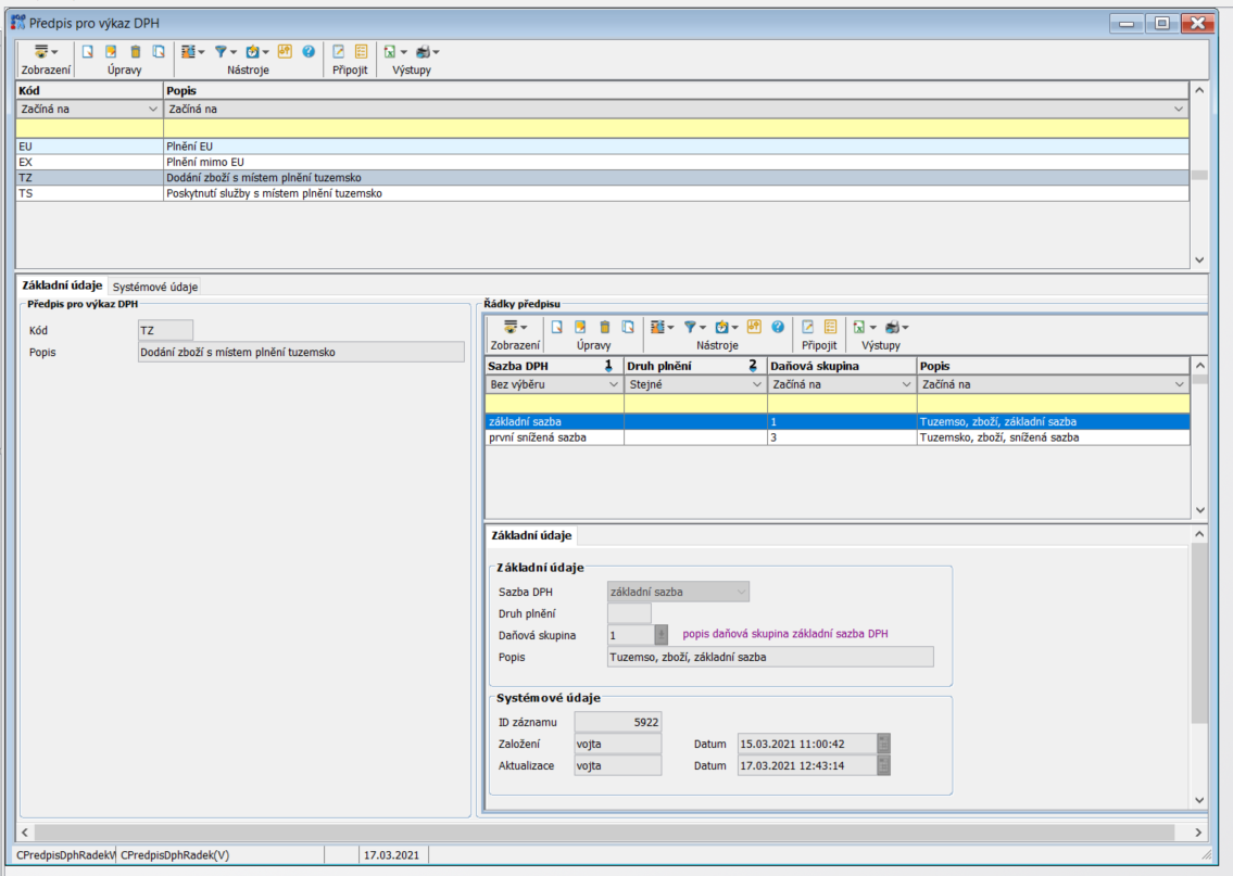 - druh plnění rozlišení pokud např pro nulovou sazbu existují různé daňové skupiny ( zboží , služby atd..)