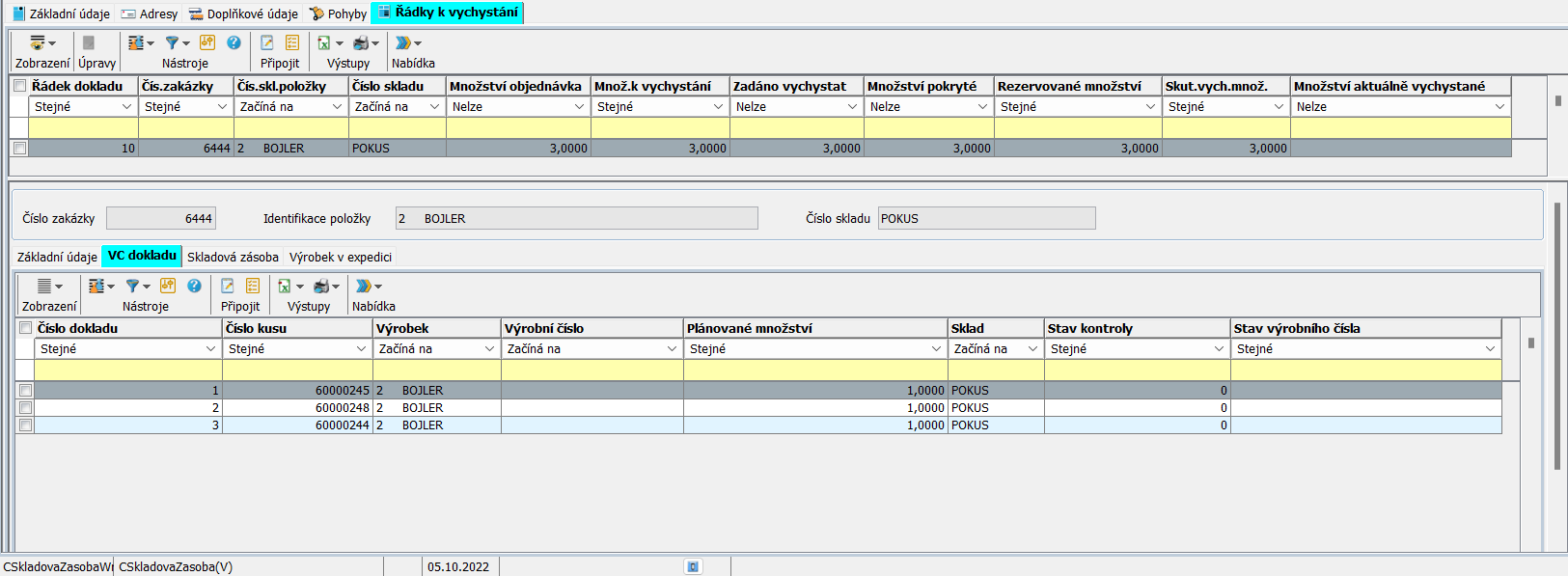 Obsahuje jednotlivé řádky (položky) spadající do daného příkazu. Každý řádek příkazu má pod sebou další čtyři záložky zobrazující Základní údaje, VC dokladu, Skladovou zásobu a Výrobek v expedici. Pokud je položka vedená v šaržích, tak se v záložce VC dokladu zobrazují čísla kusů naložených výrobků.