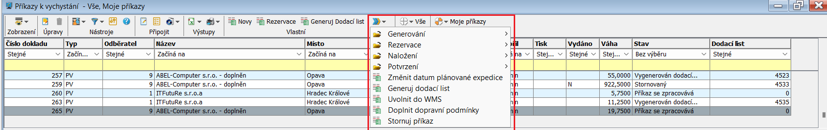 - Vše - zobrazí se všechny příkazy k vychystání