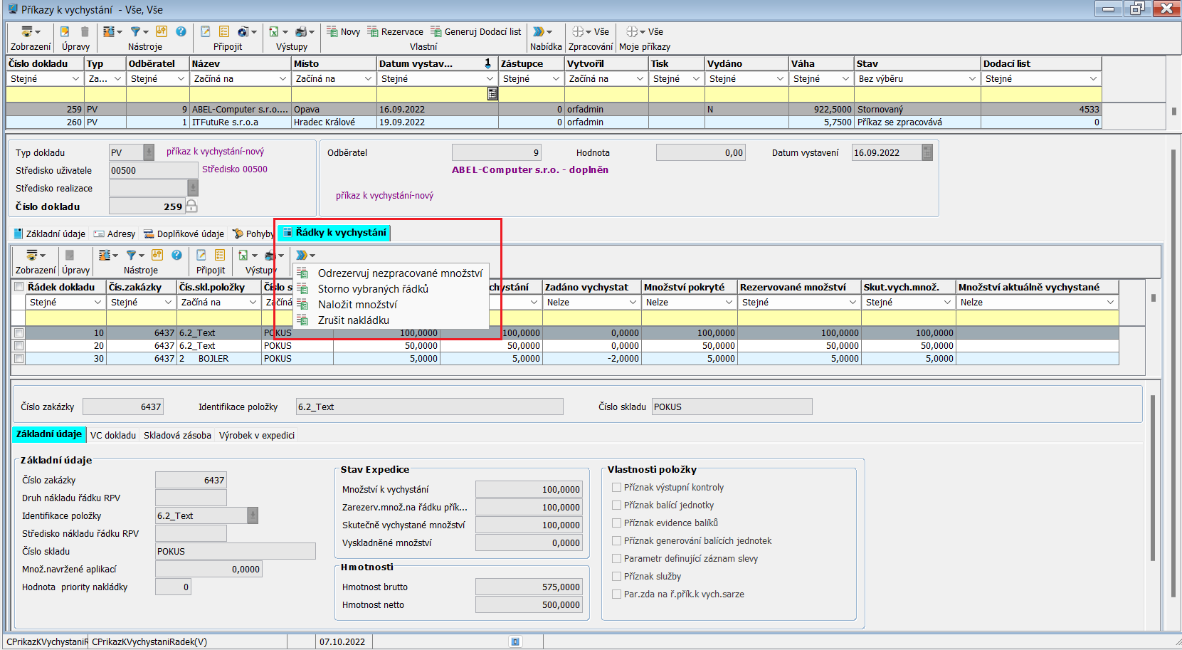 - Základní údaje - jsou zobrazeny základní údaje jako číslo zakázky, číslo skladu, stav expedice, hmotnost a vlastnosti dané položky,