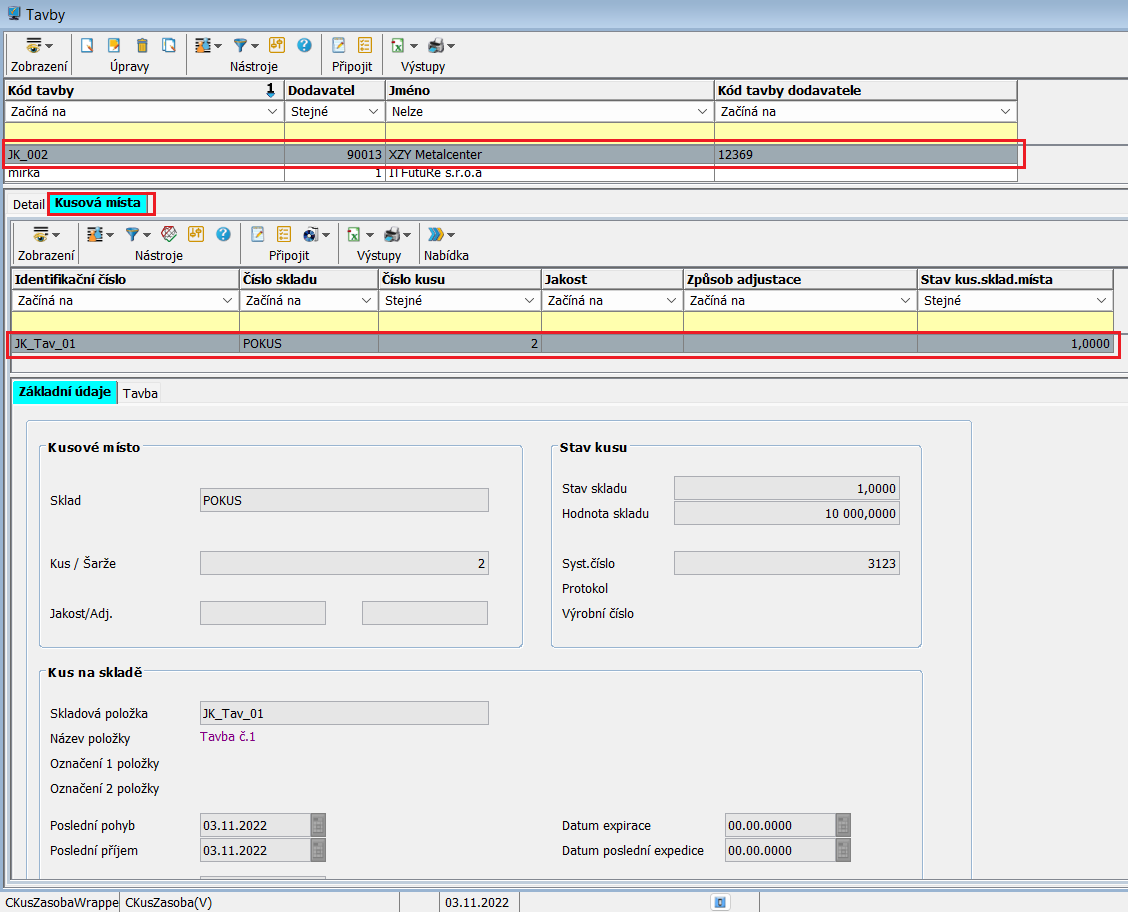 Nyní je v tabulce taveb pod záložkou Kusová místa přiřazena skladová položka s číslem kusu a je evidována pod konkrétní tavbou.