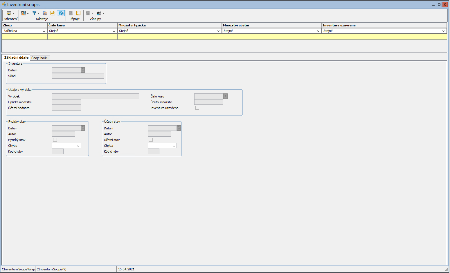 Skladová inventura využívá úlohu Inventurní soupis pro evidenci a správu inventur jednotlivých skladů.
