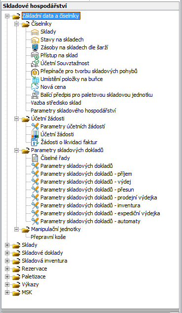 Ve složce Základní data a číselníky jsou veškeré pomocné úlohy pro úlohy v oblasti skladů. Zde lze najít hlavní a návazné úlohy, které jsou využívány pro automatické doplňování údajů při tvorbě skladových dokladů a v dalších úlohách. Do těchto pomocných úloh se uživatel dostává proklikem z detailu při vytváření nových záznamů, nebo při úpravě již existujících záznamů.