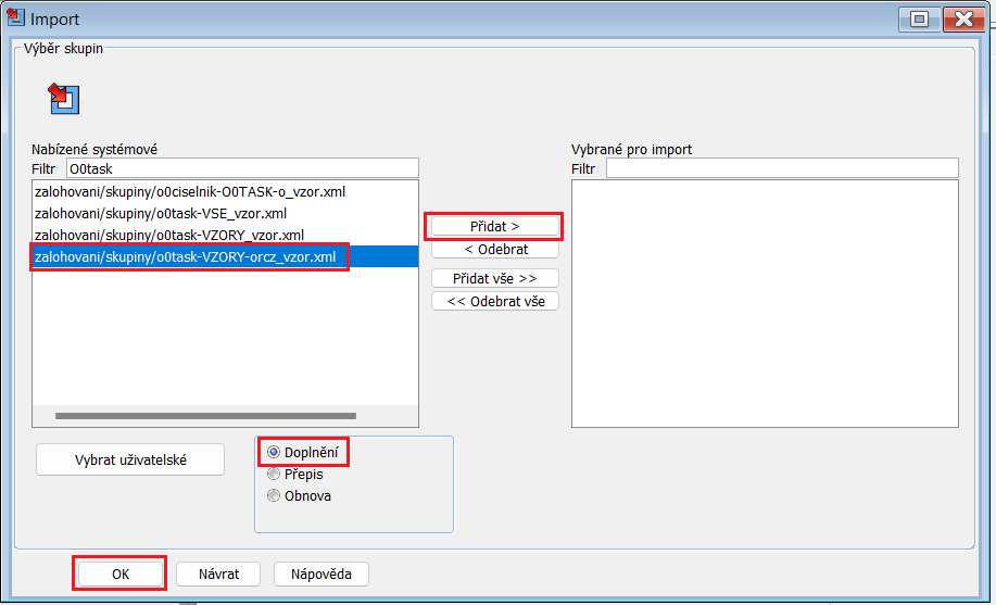 Neexistuje - li v plánovači úloh úloha pro spuštění dávkového uzavření operací, je potřeba ji sem naimportovat. Import vzorové úlohy se nachází v modulu Admnistrace - Mimořádné akce - Import/export dat - Import. Zde vyhledáme vzor pro plánovač úloh O0task-VZORY-orcz_vzor, kde se nachází vzorová úloha pro uzavírání výrobních operací. Následně zvolíme typ importu podle potřeby, v případě chybějící úlohy v plánovači úloh zvolíme doplnění. Po vybrání těchto parametrů tlačítkem Přidat přidáme vzor úlohy do plánovače úloh a potvrdíme vše tlačítkem OK.