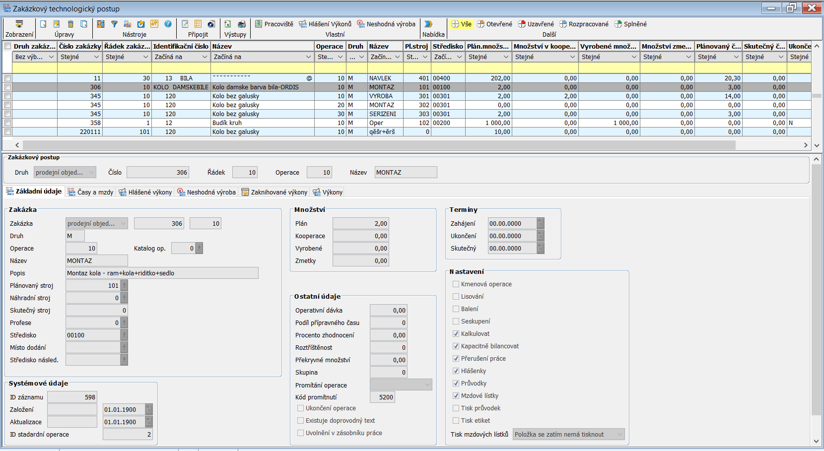 Každá operace v tabulce technologických postupů je popsána základními údaji, které specifikují danou operaci. Mezi základní údaje patří informace o zakázce (číslo, druh, název, …), množství (plánované, skutečné, zmetky), termíny (zahájení, ukončení, skutečný termín), systémové údaje, doplňující údaje a možnosti individuálního nastavení.