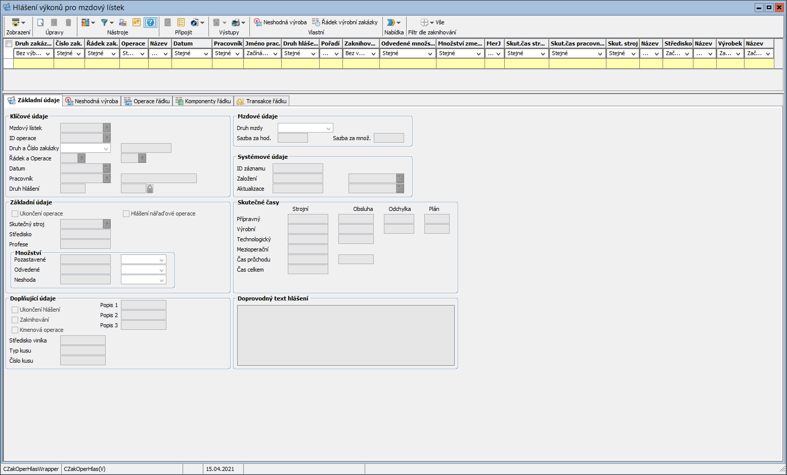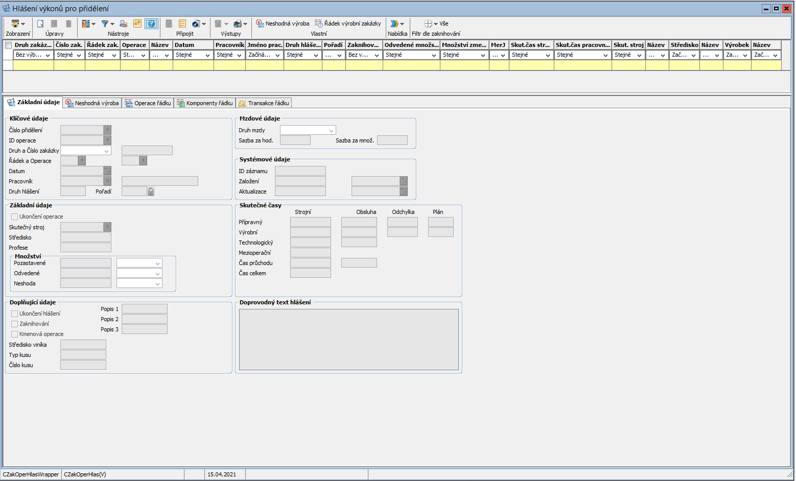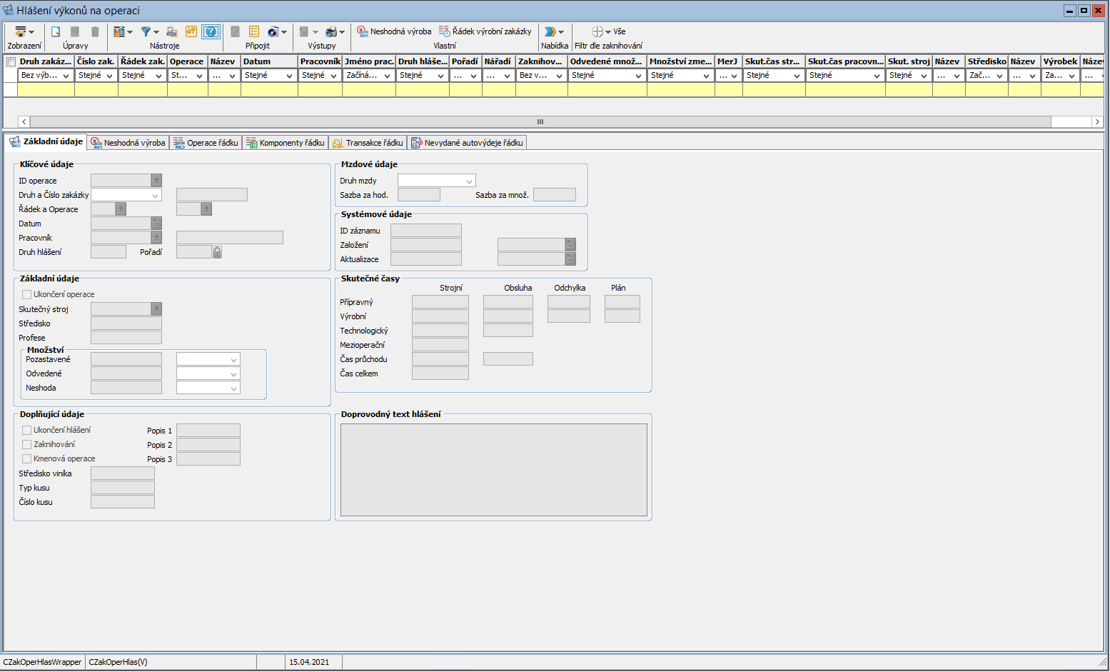 - Hlášení pozastavené (množství neshody/zmetků z předchozí operace - musí být nastaven přepínač LV_CZakOperHlas_NeshodaChybaPredchozi) či neshodné výroby (množství neshody/zmetků na této operaci)