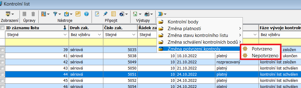 Funkce Změna stavu kontrolního listu nabízí volby pro jednotlivé fáze vývoje KL.