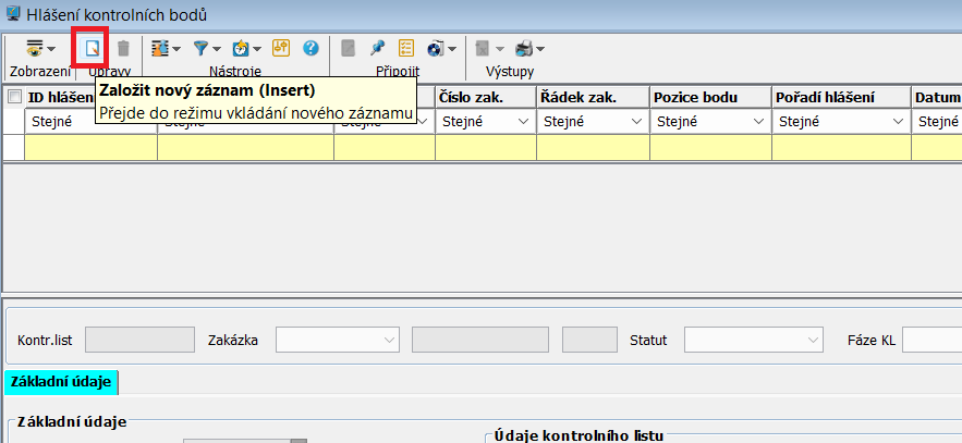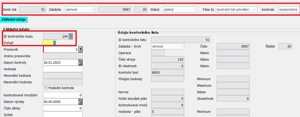 Automaticky se vyplní hlavička hlášení s číslem KL, zakázky, statutem, atd. V Základních údajích se vyplnilo nové ID kontrolního bodu a pořadí (první prováděná kontrola tohoto bodu v tomto kontrolním listě).