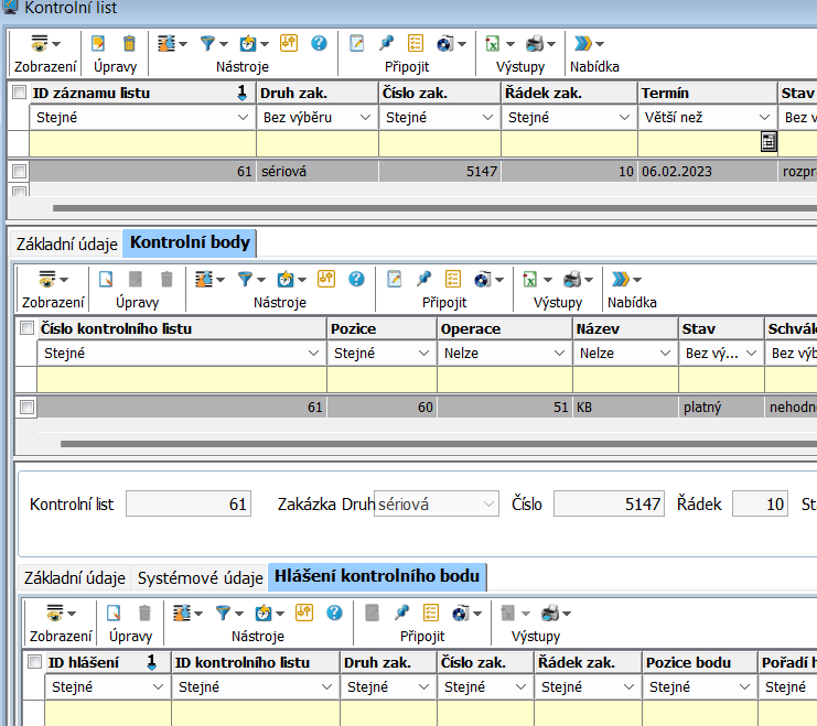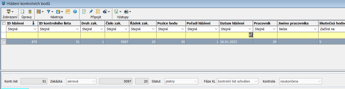 Úloha slouží pro vlastní zaznamenání naměřených hodnot kontroly do podzáložky kontrolních bodů (KB) v kontrolním listu zakázky (KL), nebo do samostatné úlohy Hlášení KB. Každý bod může být měřen vícekrát v různém časovém rozmezí a hlášení mohou probíhat formou předpisu – pověřený pracovník kontroly, typ kontroly, množství a vlastní dohlášení naměřených hodnot, ze kterých se do KL dotahují minima a maxima hodnot.