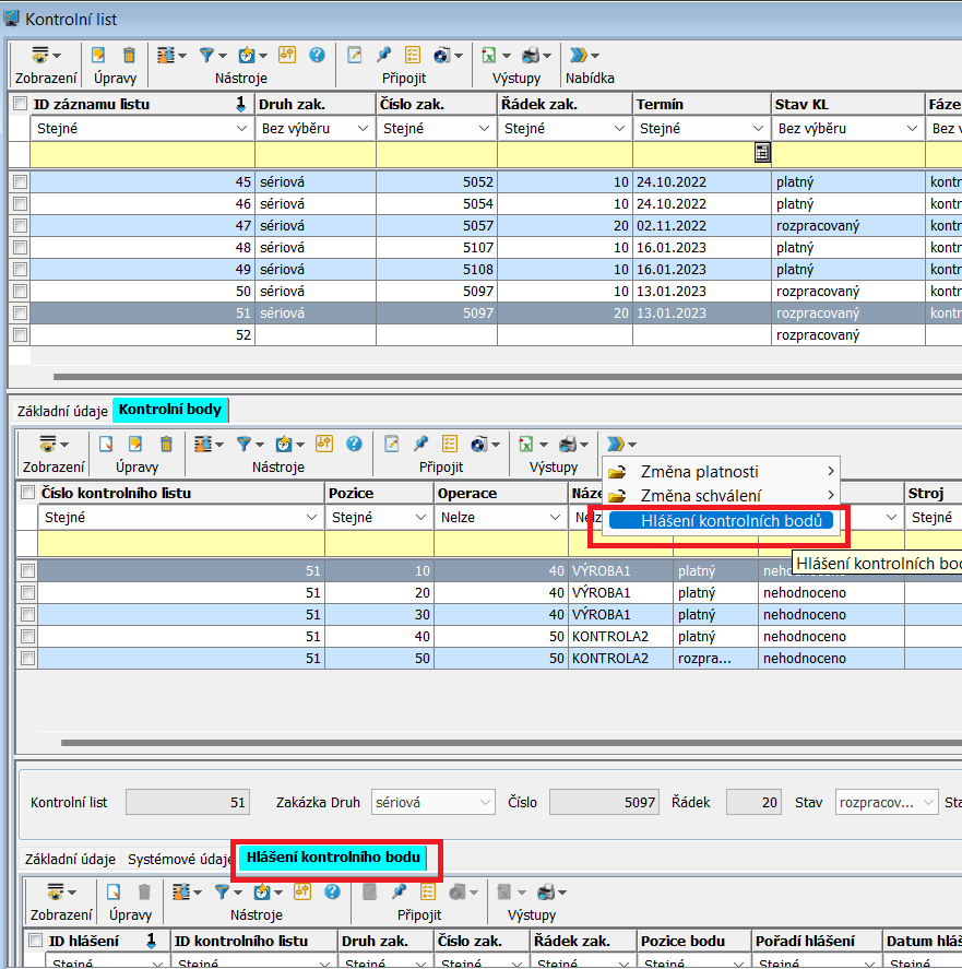 Úlohu pro hlášení KB nalezneme v menu Výroba / Kontrola jakosti / Hlášení kontrolního bodu , nebo v menu Výroba / Kontrola jakosti / Kontrolní list - záložka Kontrolní body. V jejím podmenu se nachází Hlášení kontrolního bodu.