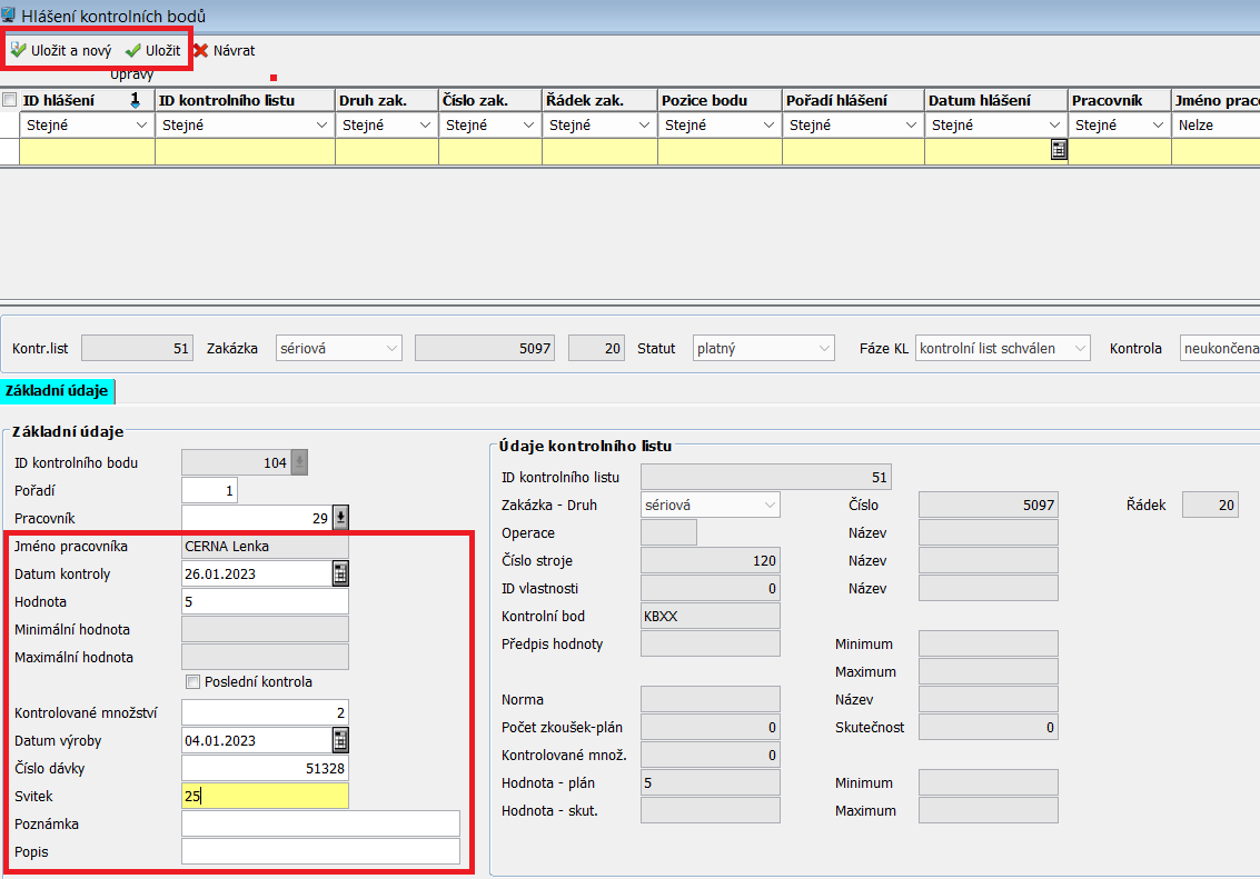, případně můžeme zvolit tlačítko Uložit a nový, pokud následuje další kontrola tohoto bodu.
