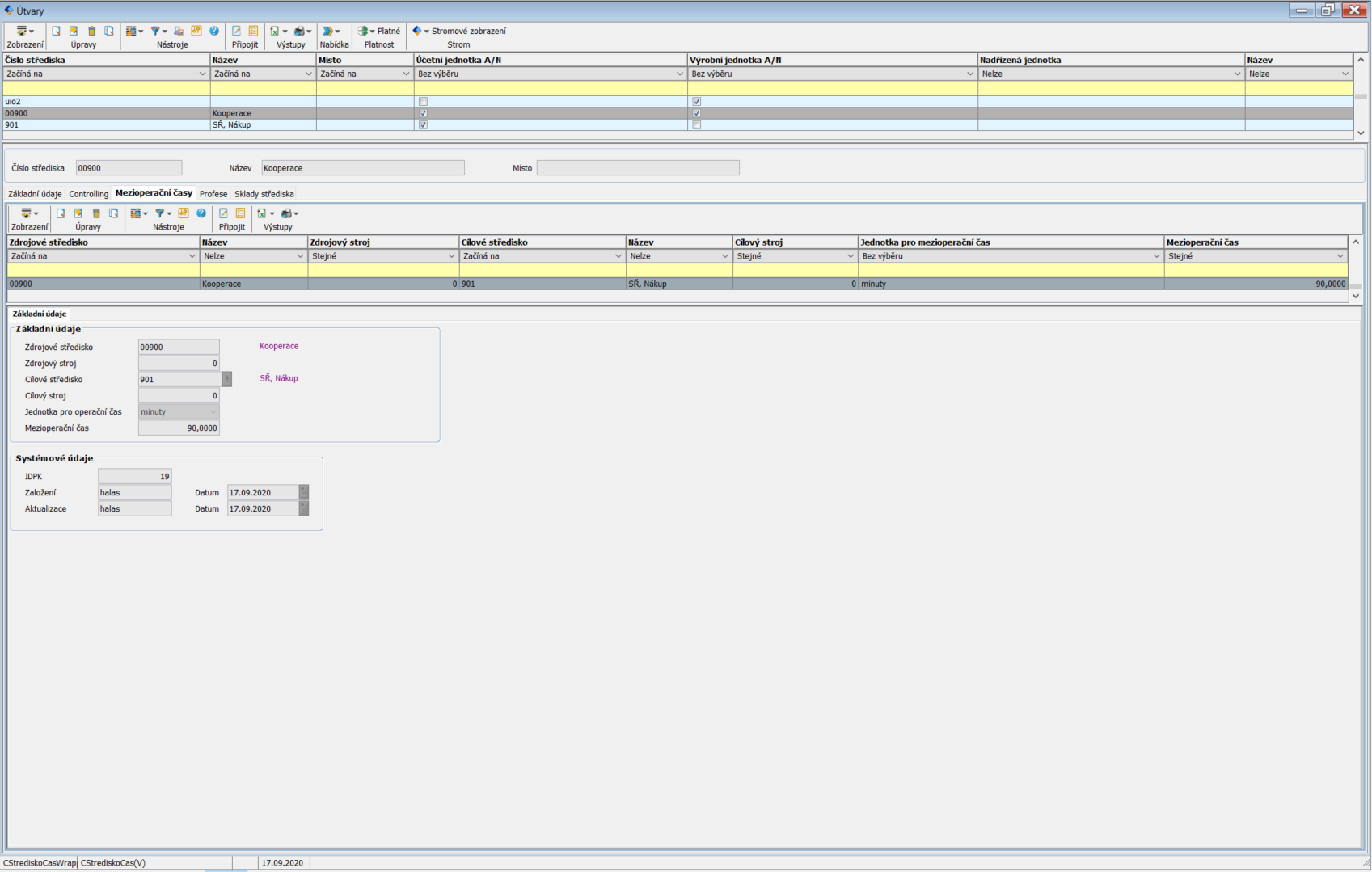 Další vlastností střediska je seznam mezioperačních časů, které uchovávají informace o zdrojovém i cílovém středisku a čas této operace.