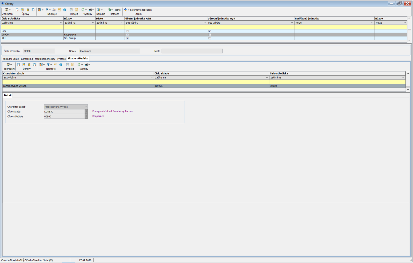 Poslední vlastností je evidence skladů střediska, tedy jednotlivé sklady, kde je uložen materiál pro dané středisko.