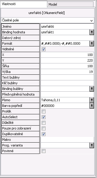 - Formát - Hodnota udává formát čísla, které je zadáváno/zobrazováno v poli. Proklikem je možné se dostat do funkce pro nastavení, kde se formát čísla vybere z rozbalovací nabídky a dopřesnění nastavení se provede zadáním dalších parametrů. Toto nastavení se poté uloží ve speciálním tvaru do textového řetězce uloženého jako hodnota vlastnosti Formát.