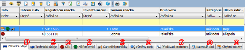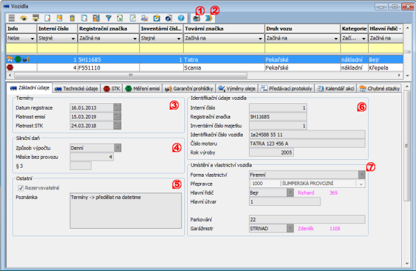 Základní identifikační údaje vozidla, jako je například registrační značka vozidla, interní číslo vozidla v rámci firmy, číslo motoru, apod.