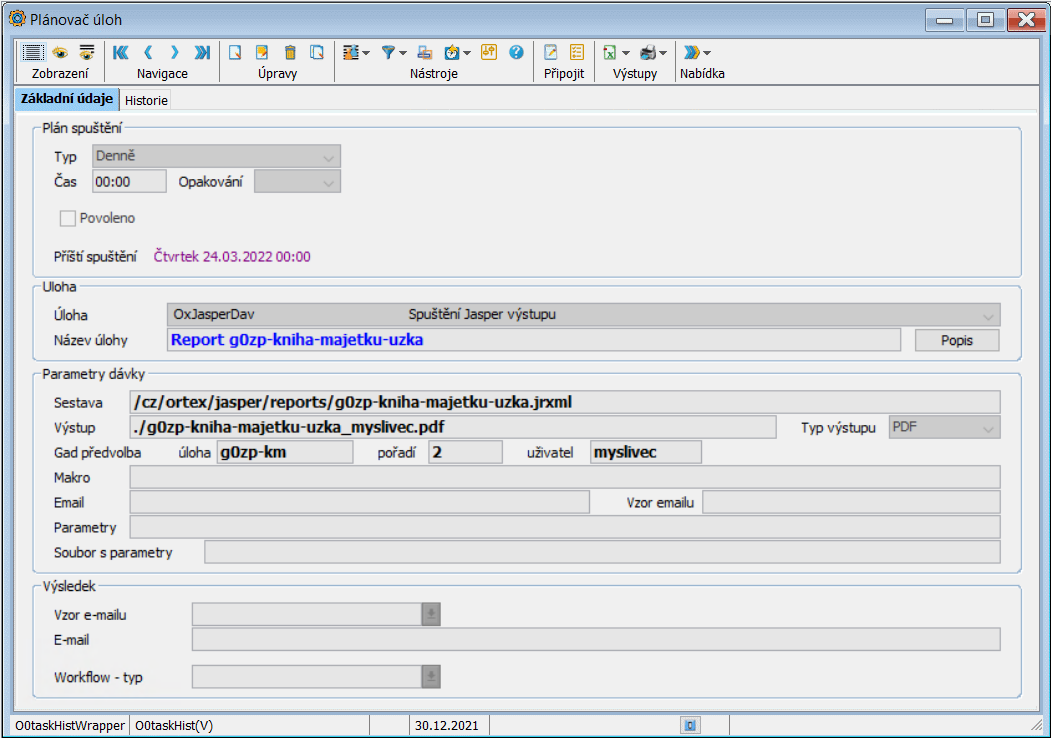 - Sestava - jméno jrxm šablony pro sestavu s celou cestou - /cz/ortex/jasper/reports/g0zp-kniha-majetku-uzkaR.jrxml
