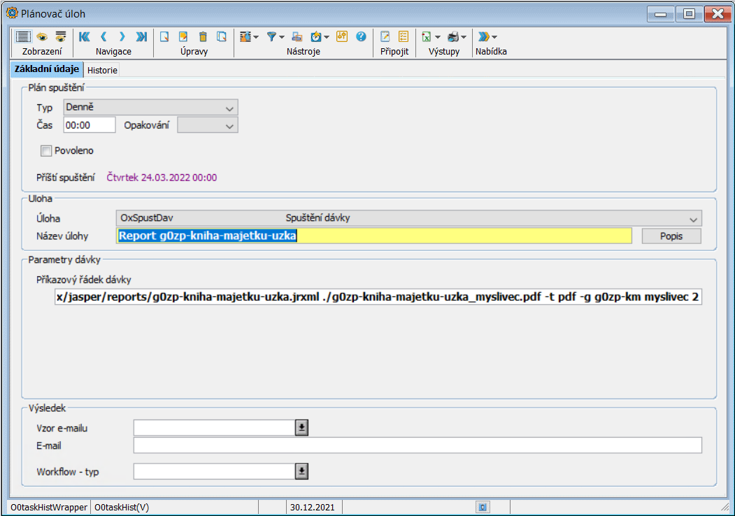 - Pozn. - některé dávkové úlohy mohou vytvářet vlastní protokol (report) o průběhu a výsledku dávky. Některé z nich umožňují i odeslání tohoto reportu na email. V tomto případě je email parametrem v příkazovém řádku (viz příklad na obr. výše).