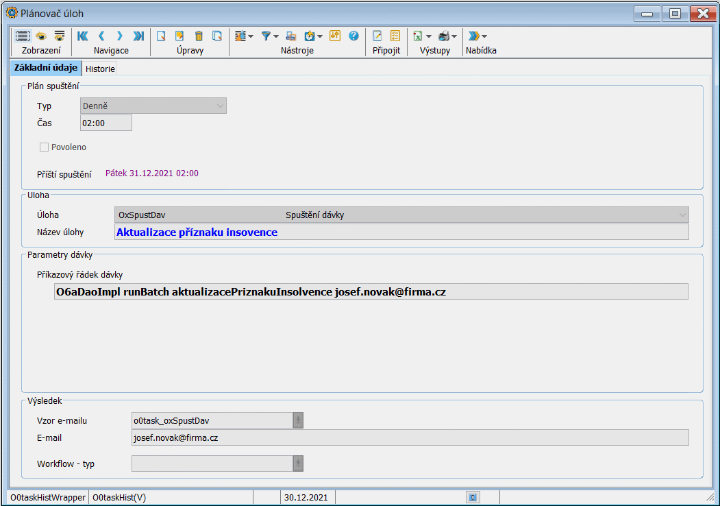 Níže je příklad naplánované úlohy pro spuštění Aktualizace příznaku insolvence. Úloha zaktualizuje příznak insolvence v adresáři firem podle interního insolvenčního rejstříku a odešle informaci o spuštění dávky.