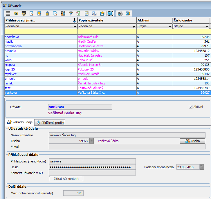 - Aktivní - příznak aktivního uživatele. Neaktivní uživatel se nemůže přihlásit do systému.